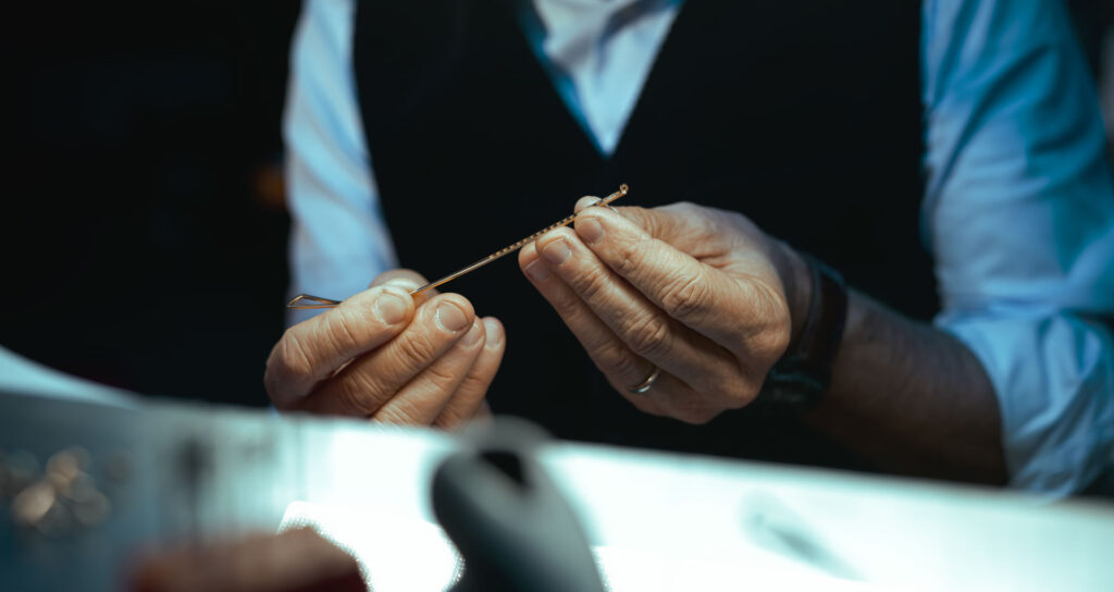Handcrafted bulinatura is a centuries-old goldsmith technique, today mastered by only a few expert artisans. It involves engraving the gold surface using a special chisel called a bulino. This meticulous process creates a delicate satin-like texture that enhances the light and sophistication of our eyewear, making each piece truly unique and exclusive.